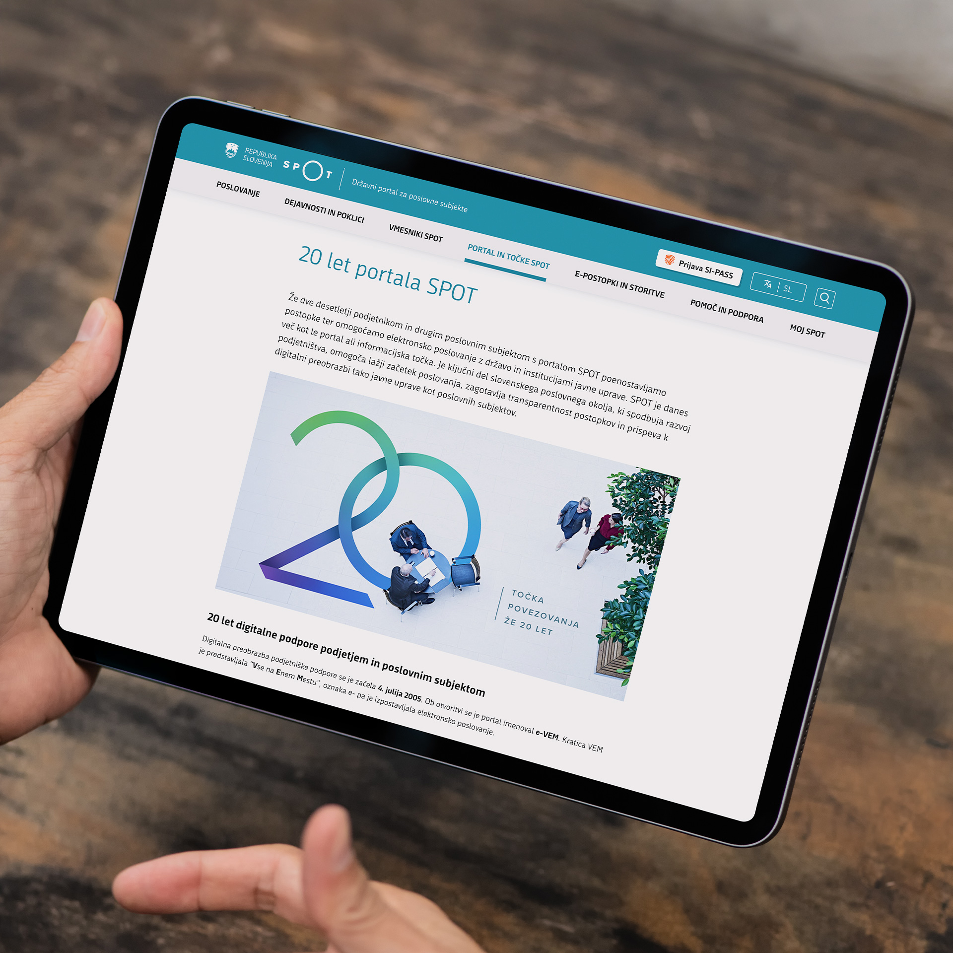 The SPOT Portal, Slovenia’s central digital hub for entrepreneurs, celebrated its 20th anniversary. From its beginnings as eVEM (“Everything in One Place”), SPOT has become a synonym for digital support to Slovenian entrepreneurship. To mark this important milestone, we prepared a special anniversary communication for our client, the Ministry of Digital Transformation, thereby upgrading the existing communications in terms of visuals and messaging.